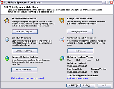 상세정보 스파이웨어 검색 숨어있는 스파이웨어를 찾아주는 기능이 있습니다. 끊어진 인터넷을 연결해주고 데스크톱이나 레지스트리 편집 등을 복구해 줍니다. 감지한 스파이웨어의 치료가 가능합니다.