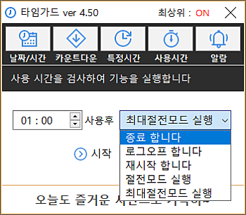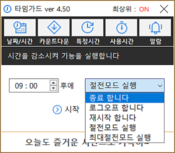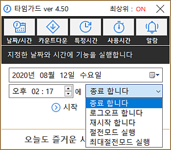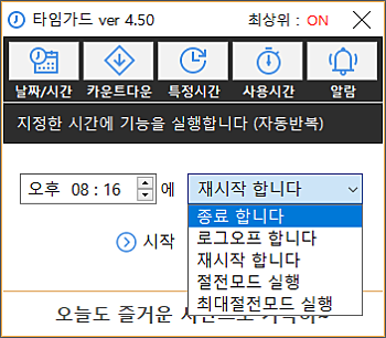 상세정보 자동 종료 지정 방식 * 특정 일자 및 시간, 카운트다운, 매일 특정 시간, 컴퓨터 사용시간, 4가지 방법으로 자동 종료를 지정 하실 수 있습니다. 자동 실행 기능 * 컴퓨터 종료, 로그오프, 재시작 기능을 선택할 수 있습니다.