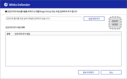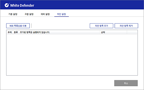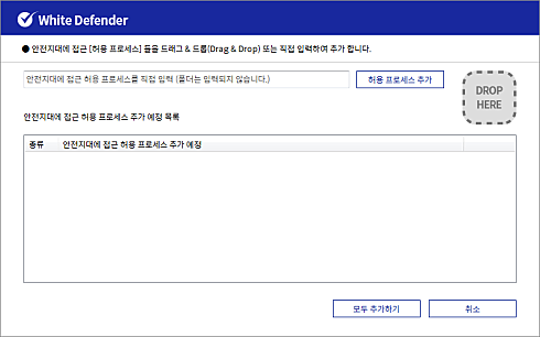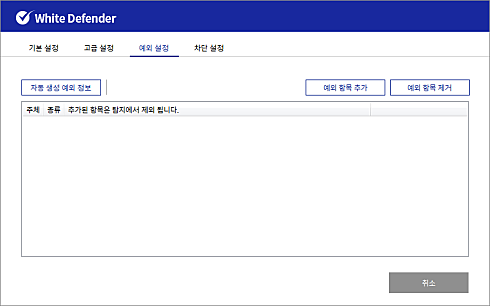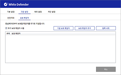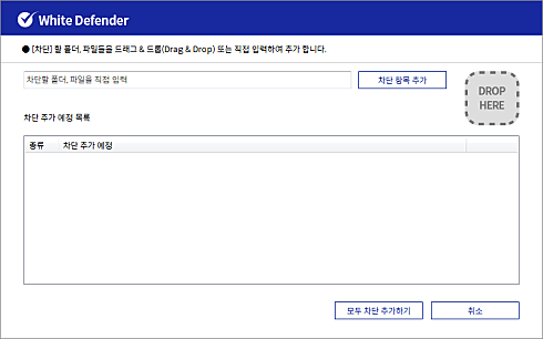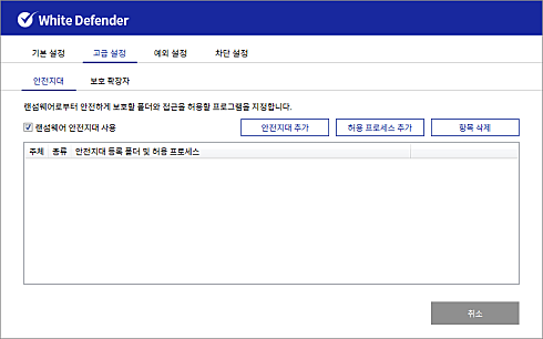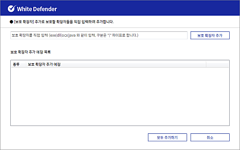 * 화이트 디펜더 실행을 방해하는 여러 가지 위험요소에 대응할 수 있도록 핵심 프로세스를 보호하며, 알 수 없는 원인에 의하여 삭제되더라도 업데이트를 통해 복원됩니다.