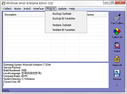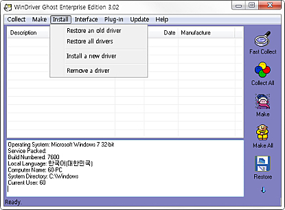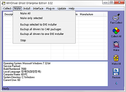상세정보 드라이버 백업 및 복구 드라이버를 백업 및 복구해줍니다. 하드웨어의 최신버전 설치 하드웨어의 최신 드라이버를 찾고 설치해주는 기능이 있습니다. EXE프로그램 생성 exe 설치 프로그램을 생성해줍니다. 드라이버 제거 드라이버 제거 기능을 제공합니다. 하드웨어 설치 마법사 하드웨어 설치 마법사 기능을 지원합니다.