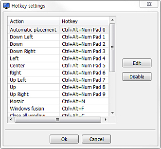 기본적으로 설정된 핫키는 "CTRL + ALT + 숫자키패드(1~9)" 와 모든 창 닫기(CTRL + ALT + C), 모자이크(CTRL + ALT + M), 왼쪽 오른쪽으로 이동(CTRL + ALT + Left/Right), 모든 창 최소화(CTRL + ALT + Page Down), 창 최대화(CTRL + ALT + Page UP), 액티브 창 툴((CTRL + ALT + T) 입니다.