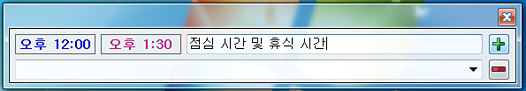 상세정보 알람 기능 시간, 분 설정으로 원하는 시간에 모니터 중앙 알람 시계 표시 기능을 제공합니다. 플랜 기능 원하는 시작시간과 끝 시간을 설정하여 현재 시간에 따라 마우스 클릭과 더블클릭으로 진행률 확인 기능을 제공합니다. 편의 기능 바 형태이고 항상 위에 있기 때문에 작업에 지장 없이 사용 가능하고 마우스만으로 기본 입력 조작이 가능합니다.